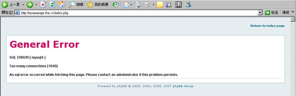 內文如標題... 最近論壇常常1-2週就會發生關於... General Error SQL ERROR [ mysql5 ] Too many connections [1040] An sql error occurred while fetching this page. Please contact an administrator if this problem persists. 的錯誤...(忘記截圖了...不過大概是這樣的描述) 原因之一是有某些機器人...一次來30-40隻...會一直在爬會員列表或是搜尋... 導致於MYSQL連現過多資料量過大就盪掉了... 當論壇當掉時....