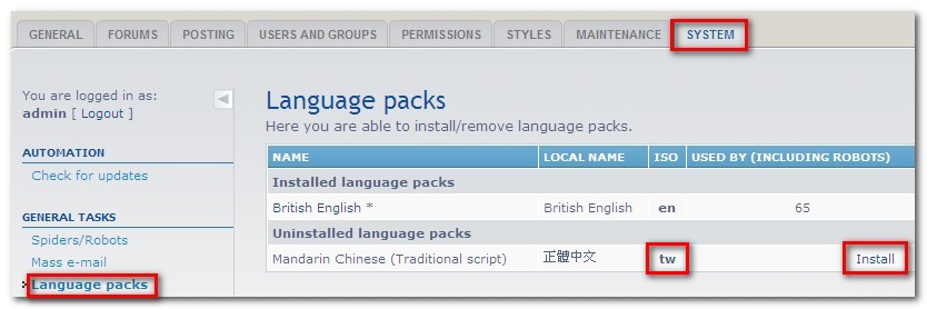 3. 進入 ACP -> SYSTEM -> Language packs -> YOUR_LANG (tw) -> install