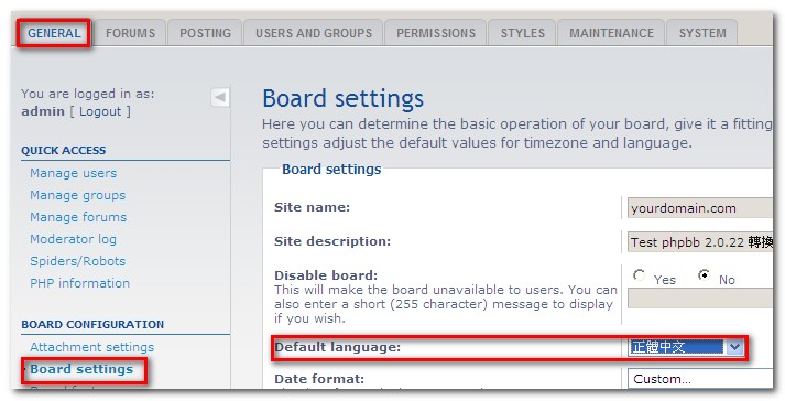 4. 安裝後 -> GENERAL -> Board settings -> Default language -> 正體中文 -> Submit