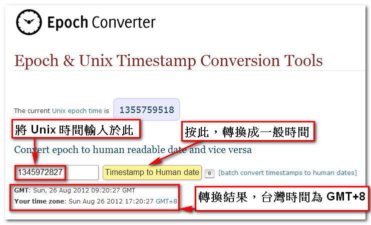 - 利用 Epoch & Unix Timestamp Conversion Tools 網站,將其轉換成一般時間為 2012-08-26 09:20:27(GMT)。