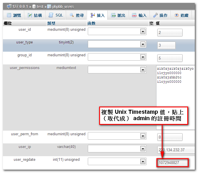 調整(phpBB 3)測試論壇會員(admin)的註冊時間(如下圖) 。 步驟: