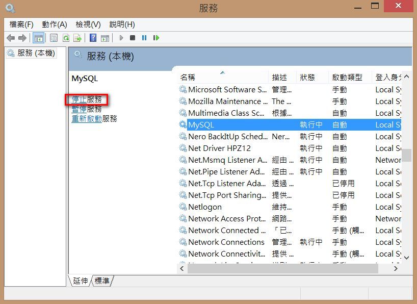 先將原先備份的 my.ini 檔案,複製到 C:\Windows\System32\ 底下;再重新啟動 MySQL 即可。