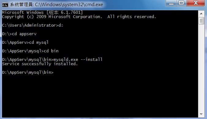 於 DOS 視窗底下,找到 /bin/ 底下 mysqld.exe 的位置後,先空一格,再輸入「--install」後,按「Enter」 ,即可安裝 MySQL 伺服器。