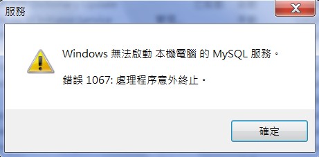 若系統主機在非正常程序下關機,則重新開機後,恐怕 MySQL 會出現 1067 無法啟動的錯誤。