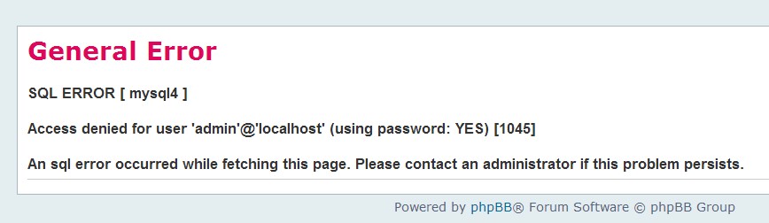 雖然,成功安裝、啟動 MySQL 5.6.10 伺服器,但是連線到論壇時,會出現底下類似的錯誤訊息。因為全新的伺服器上,並沒有您所設定的論壇資料庫之使用者(admin),所以我們必須新增使用者。