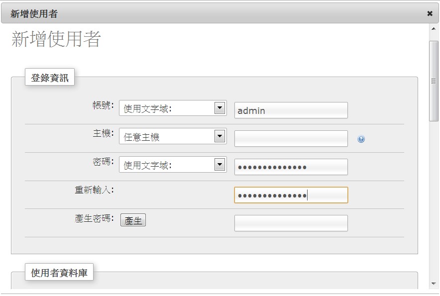輸入帳號、主機(一次選「任意主機」,一次選「本地」 )、密碼。