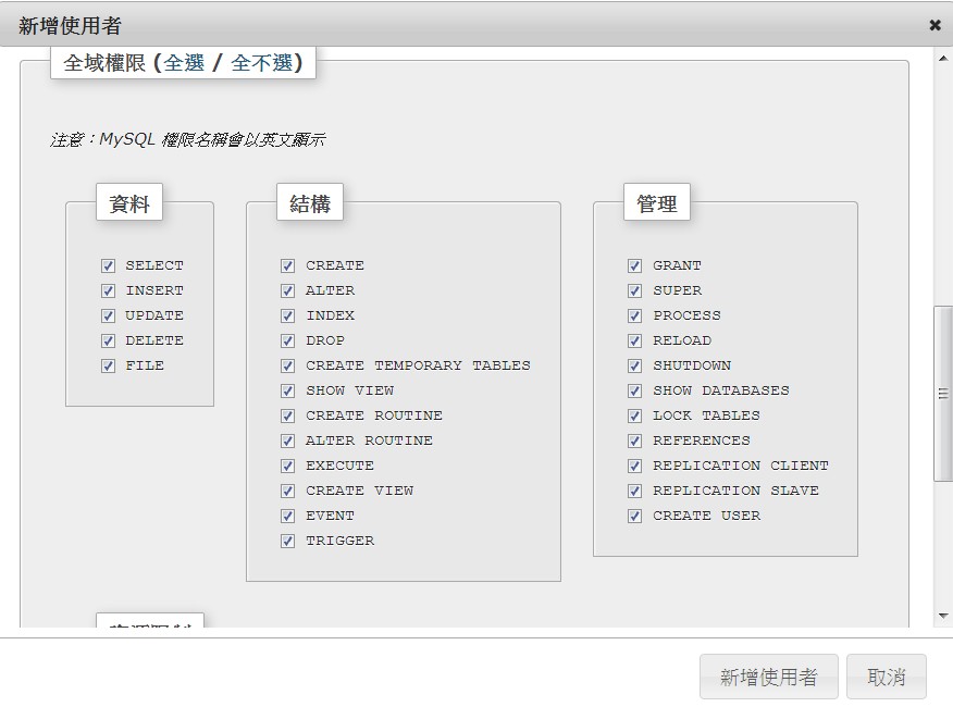 以往的 MySQL 升級過程中,在處理完 my.ini,重新啟動 MySQL 伺服器前,我都是先將(data/mysql)舊的 user 資料表還原,省略了新增使用者的步驟。