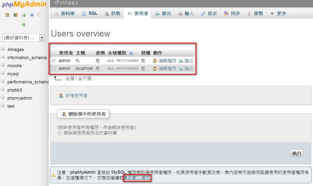 新增使用者(admin)兩次後,建議刪除所有預設的「root」使用者。 也就是說,伺服器上,只剩下兩位剛剛所新增的使用者(admin)而已。記得點一下「重新載入權限 」。