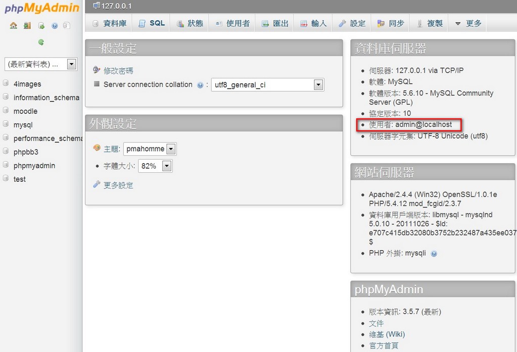 本文的 phpMyAdmin 為 3.5.7 版圖示