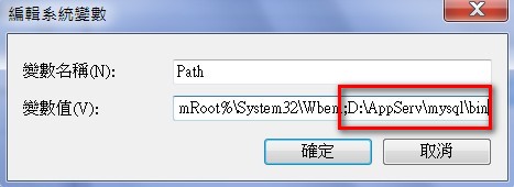 按鍵盤 [End] 鍵,在最末端先以半形分號區隔,再輸入您安裝 MySQL 的路徑。(如下)