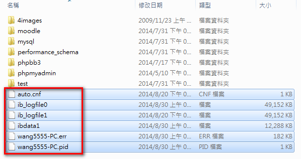 再將資料庫(資料夾)以外的檔案刪除(如下圖)後,重新啟動 MySQL 即可。