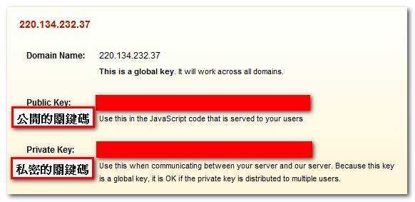 - 輸入「公開的 reCaptcha 關鍵碼」以及「私密的 reCaptcha 關鍵碼」> 送出