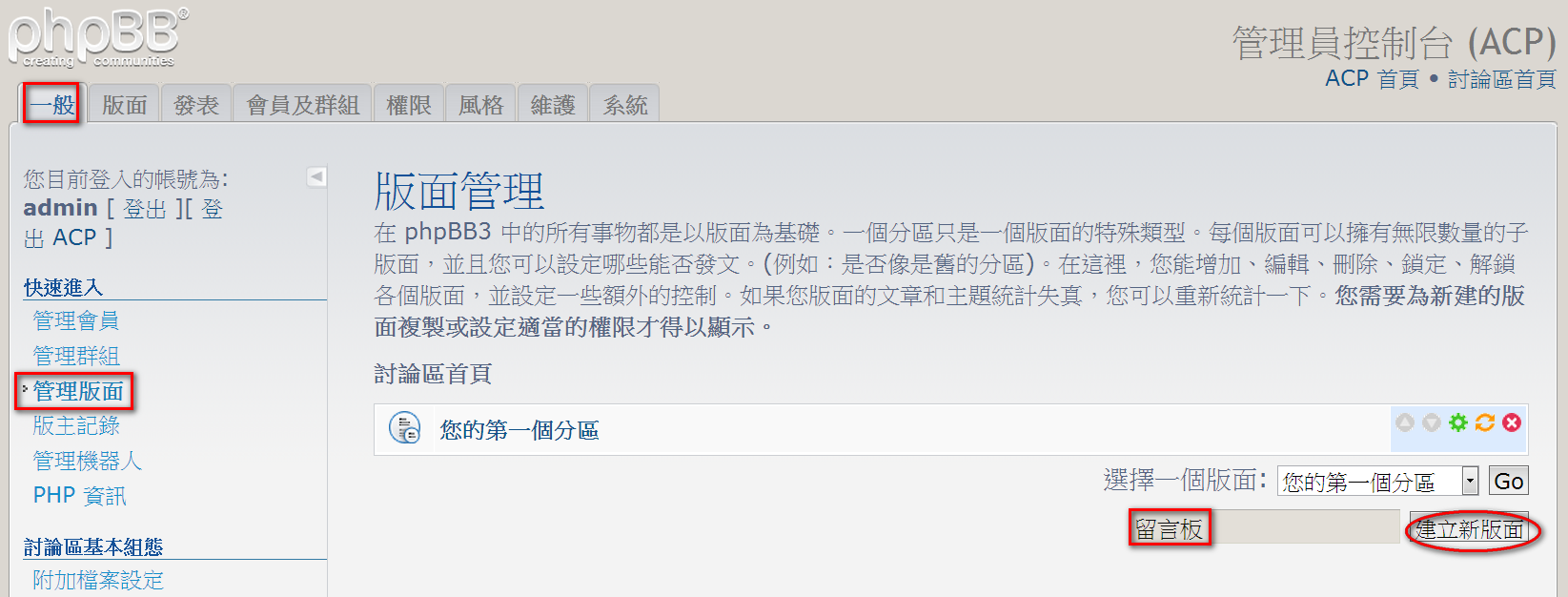 - 一般 -> 管理版面 ->(選擇適當的分區)輸入「留言板」,按「建立版面」。