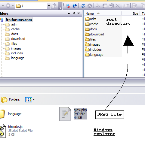 它會要求您去移動本地的檔案 (例如: 從您已經下載到您電腦的壓縮包檔案中之一) root/ajax.php to ajax.php 到伺服器上. 當它沒有特別指定路徑時 (例如: 它沒有說 admin/ajax.php 或 includes/ajax.php) 它的意思就是要將檔案上傳到伺服器 phpBB3 的根目錄中. phpBB3 的根目錄是存放 viewtopic.php, viewforum.php,... 等檔案的位置.