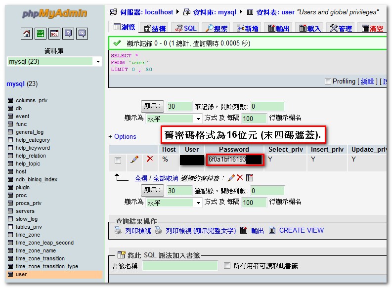 - 進入 SQL 頁面, 執行更新 "密碼格式" 命令:P.S.