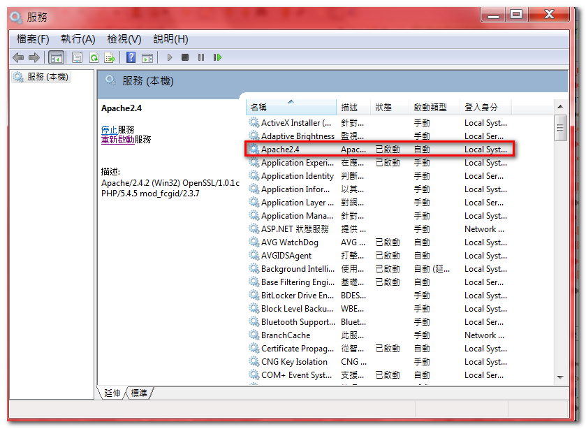 注意!需要修改 httpd.conf 的 LoadModule php5_module 之動態連結函式庫為 php5apache2_4.dll。 - 移除 Apache 2.2.22(建議保留 /Apache2.2/ 資料夾;至少,保留原來的 httpd.conf 設定檔,作為修改的參考)。