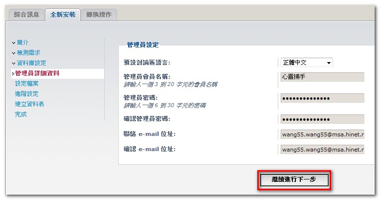 ps. 譯文 '資料庫密碼' 修改為 '資料庫管理員密碼' 較適宜 6. 下一步 7. 論壇管理員設定 8. 下一步 9. 寫入論壇設定檔 10. 進階設定 :: E-mail 設定