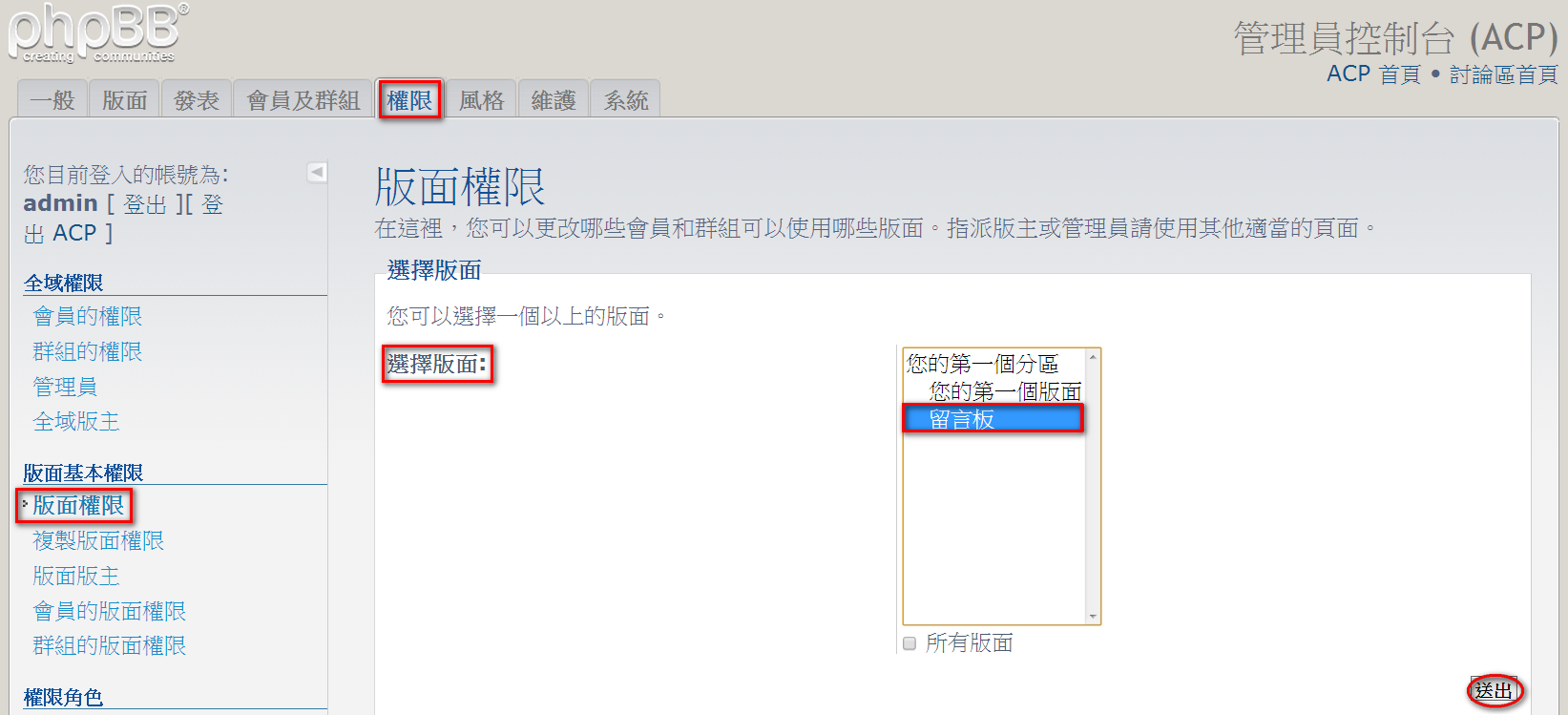 - 點選標籤「權限」-> 版面權限 -> 選擇版面 -> 點選「留言板」,按「送出」。