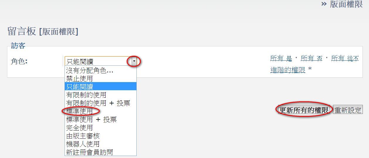 - 預設訪客的權限是「只能閱讀」;點選下拉式選單,將它改為「標準使用」,再按「更新所有的權限」。